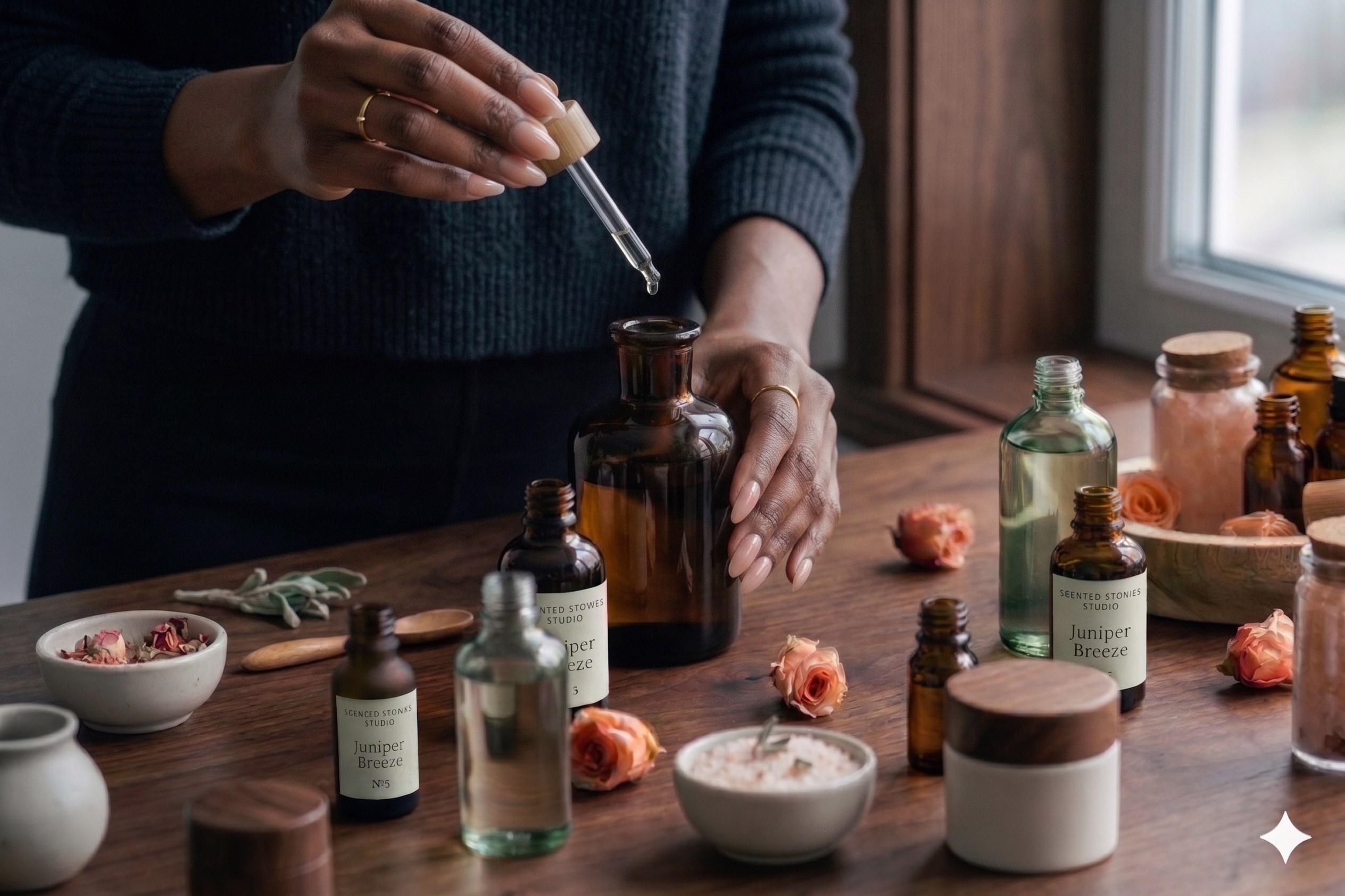At Scented Stories Studio, we invite you to Seek inspiration in every note, Meet your true scent identity, Greet your senses with curiosity, Embrace the craft of blending, and Love what you create.